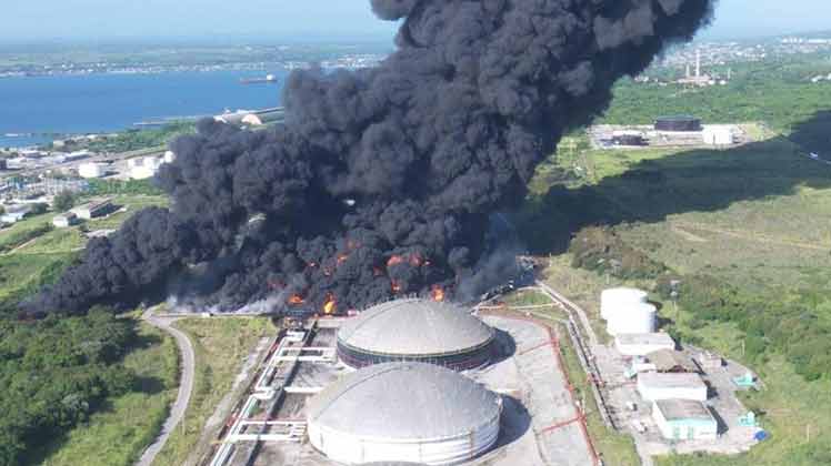 Na sexta-feira à noite, um incêndio deflagrou quando uma descarga elétrica de uma trovoada atingiu o 52º tanque de armazenamento de petróleo bruto na Base do Superpetroleiro Matanzas.