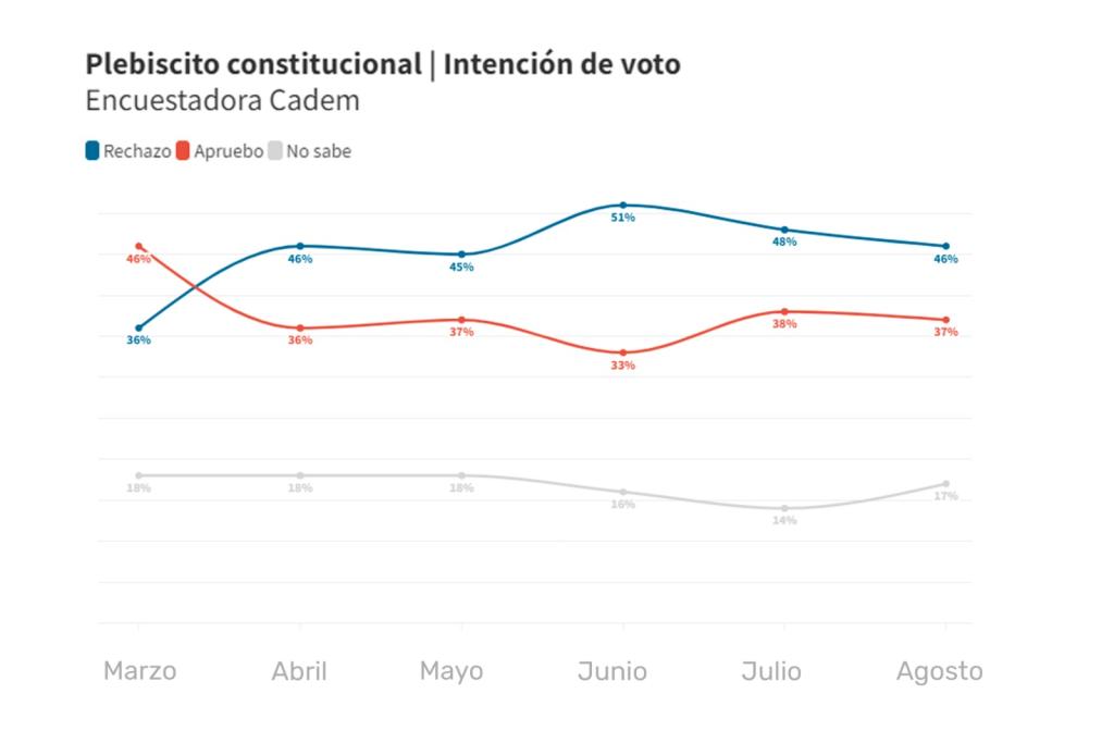 Cadem, entretanto, apresentou um relatório no qual 46% apoiou a rejeição, 37% a aprovação e 17% disse que estavam indecisos. Esta empresa projectou, considerando as margens de erro, que o cenário de votação "mais restrito" seria de 52% para rejeição e 48% para aprovação.