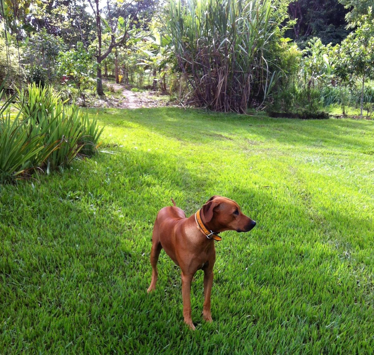 Os Rhodesian Ridgeback (ou Leões-da-Rodésia) podem fazer até 32km/h numa corrida. Eles se chamam assim porque, ao longo da coluna, possuem uma linha de pelos na contramão dos outros, característica da raça. “Ridge” quer dizer “crista”. Leio na Wikipedia que eles foram criados no atual Zimbábue pelo povo nômade Hottentot (ou Khoikhoi), através de cruzamentos seletivos entre cães vindos da Europa. “Um de seus ancestrais era um cão semi-selvagem (o Hottentot Dog) usado para a guarda. Acredita-se que esta raça tenha vivido no Egito Antigo, 4.000 a.C, já que cães com ‘cristas’ foram retratados em murais egípcios.”