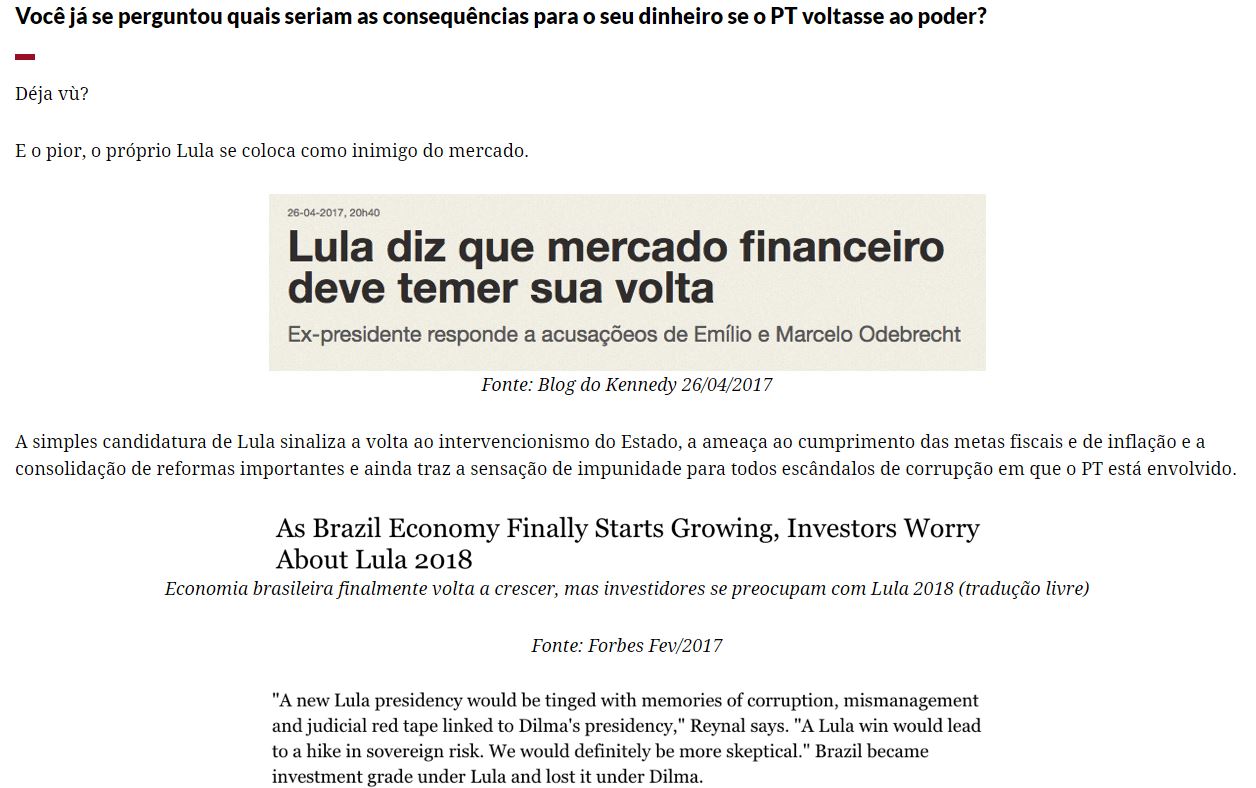 Nela, ela usa como principal gancho o retorno de Lula - que tirou o Brasil da decima-terceira economia do mundo e levou para sexta, hoje, ainda, nona posição, pagou a dívida com o FMI, triplicou o PIB, e multiplicou por 10, para 340 bilhões de dólares, as reservas internacionais - à Presidência da República e também defende, em outra peça de propaganda, a condenação definitiva do ex-presidente como um fator de melhora da situação para os investidores.
