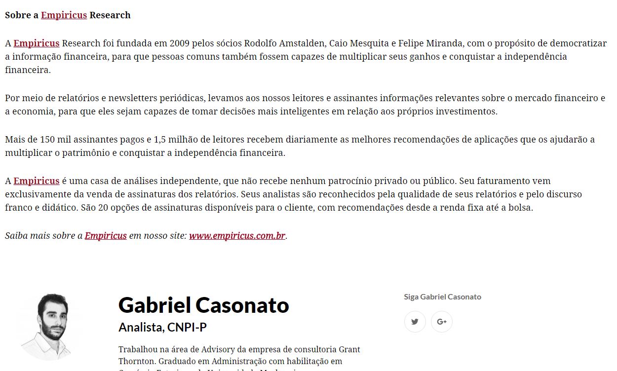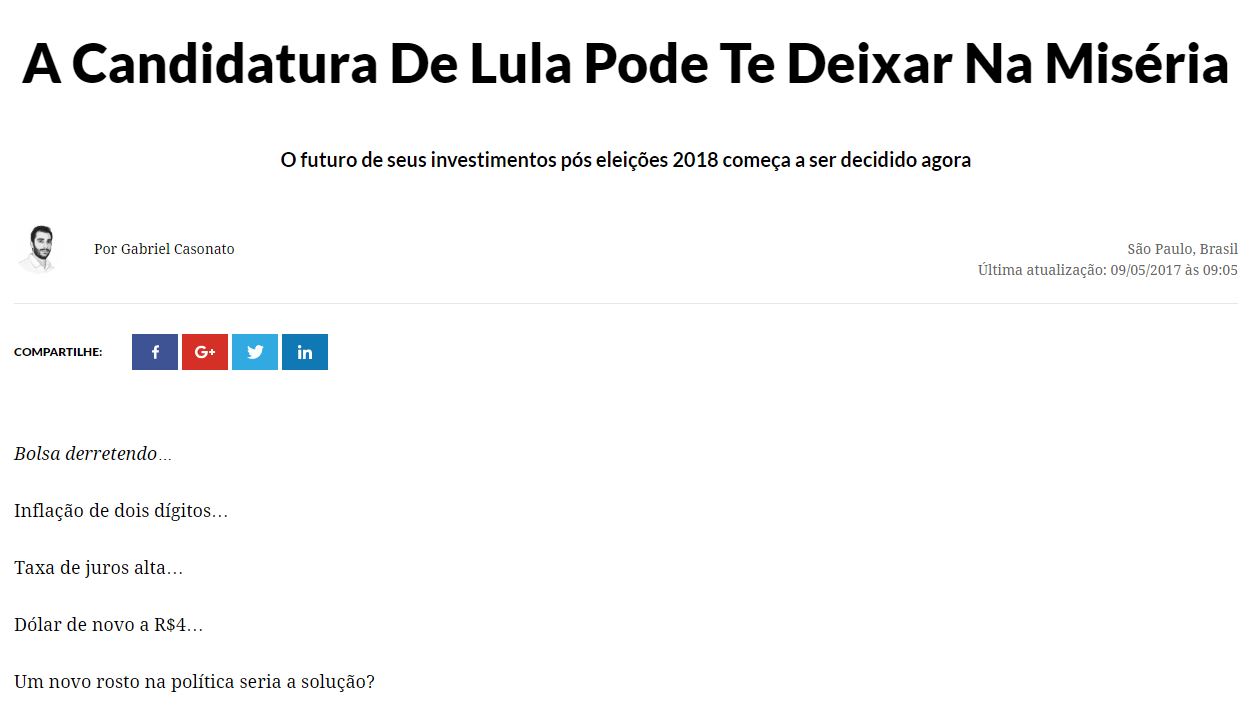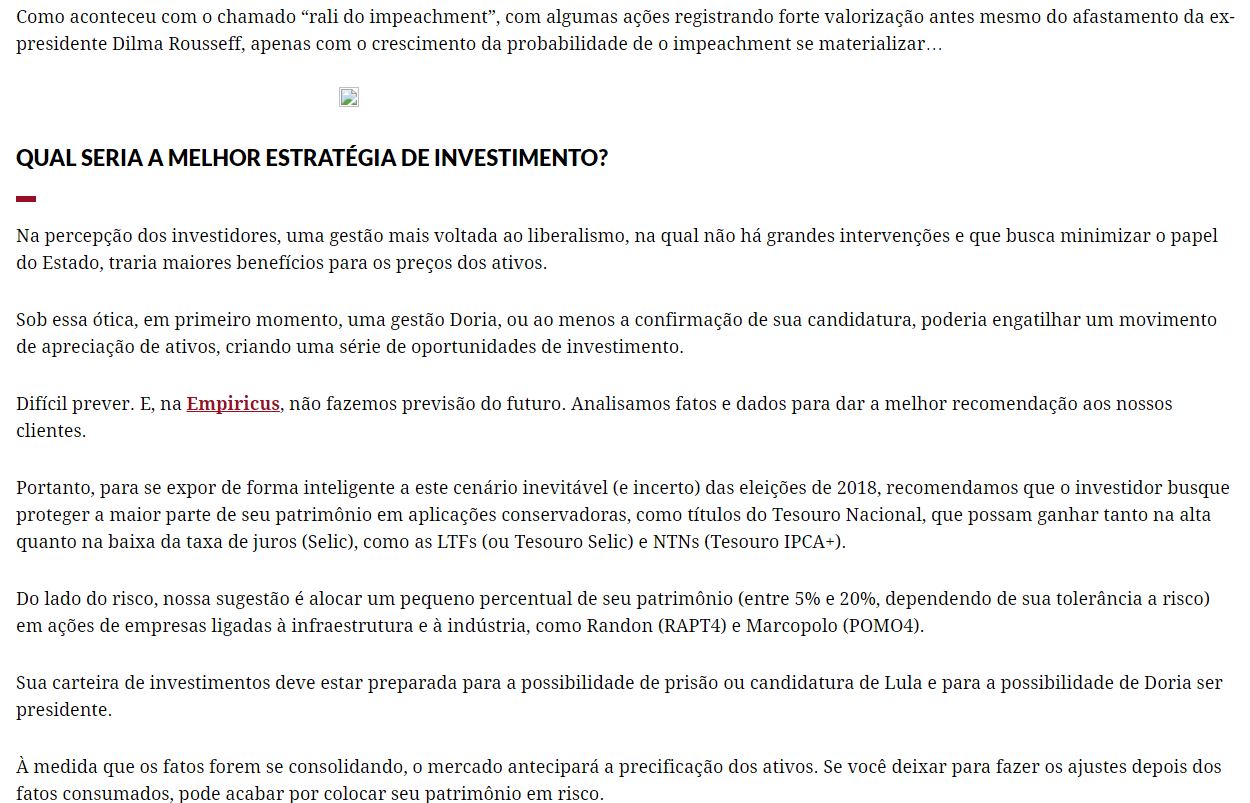 Agora, com a mesma estratégia, já denunciada, entre outros, por Fernando Brito, Tereza Cruvinel e Denise Assis - a de apresentar um discurso escarradamente político, em sua forma e consequências, como peça de propaganda de uma pseudo "análise exclusiva" - essa mesma empresa, a EMPIRICUS - sócia do site Antagonista e já processada pela CVM e o MP de São Paulo - está promovendo outra campanha milionária, que, no lugar de "O FIM DO BRASIL" traz como apelo o alerta "A AMEAÇA QUE PODE ARRUINAR COM O PATRIMÔNIO DE SUA FAMÍLIA".