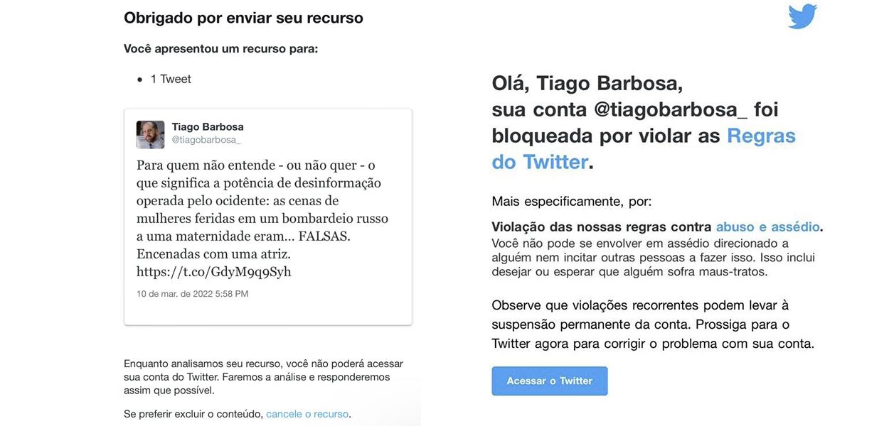 "O Twitter decidiu censurar e bloquear minha conta na rede em virtude de um tuíte crítico às cenas de um bombardeio em Mariupol"
