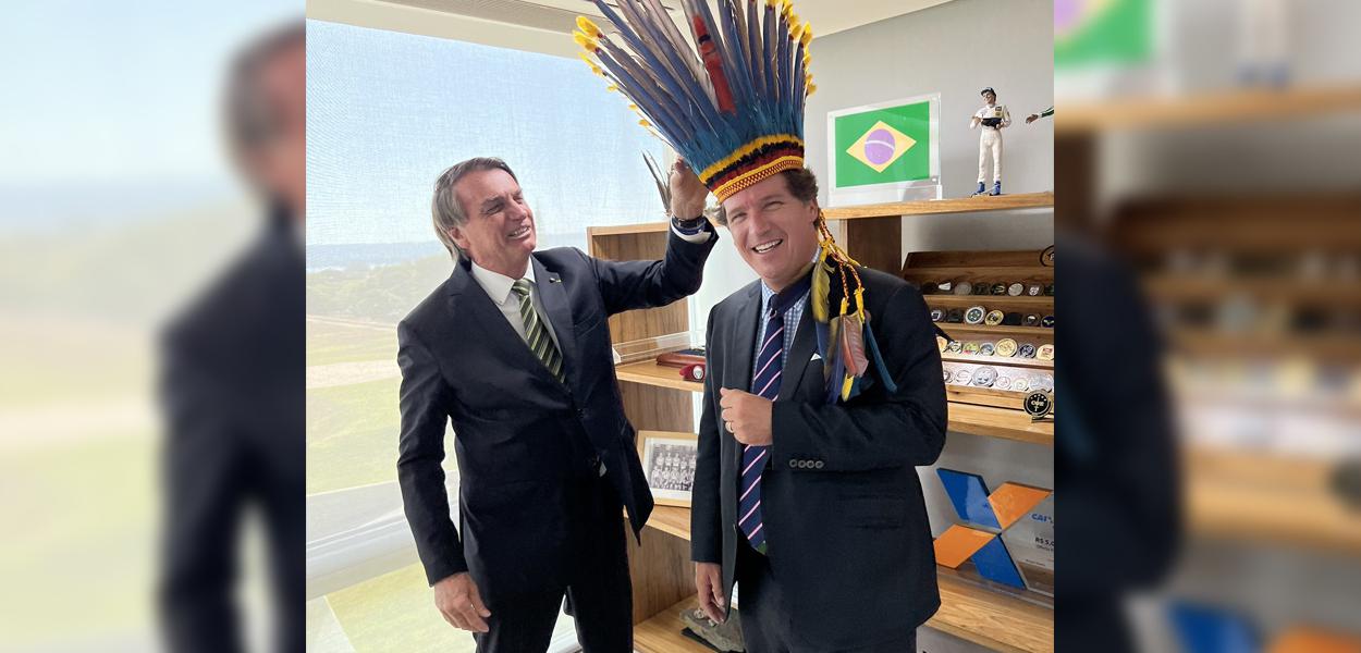 247 - Jair Bolsonaro celebrou a chegada do apresentador da Fox News Tucker Calson presenteando-o com um cocar indígena. O trumpista está no Brasil para uma entrevista com o chefe de governo, concedida nesta quarta-feira, 29.