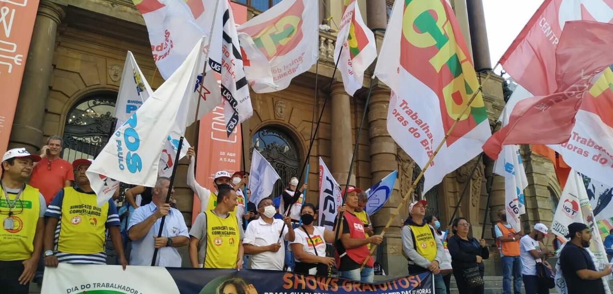 Em frente ao Theatro Municipal de São Paulo, os sindicalistas conversaram com os trabalhadores e divulgaram a atividade do 1° de Maio.