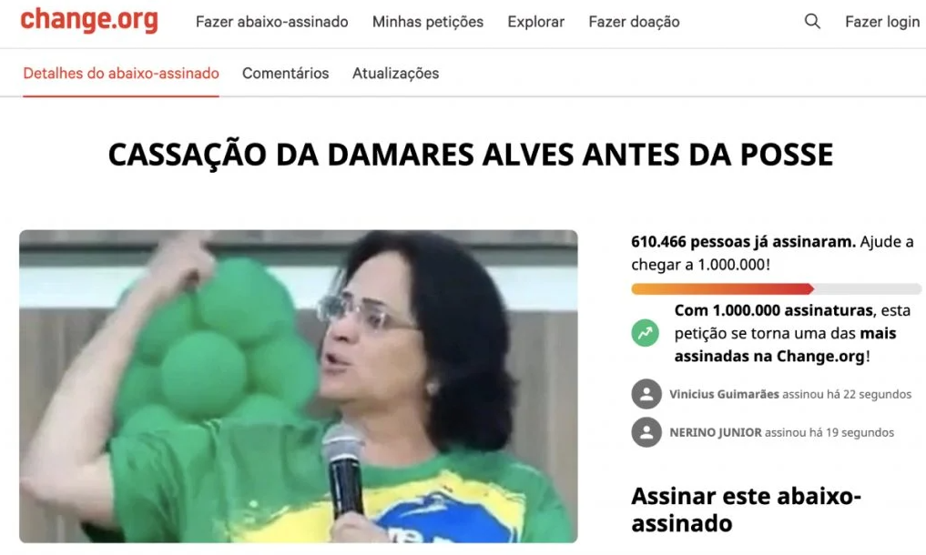 O abaixo-assinado foi lançado nesta terça-feira (11) e, na tarde desta quinta, já ultrapassava a marca de 600 mil assinaturas. A petição, de autoria de Maria Christina Mendes Caldeira, usuária da plataforma, afirma que Damares teria mentido ou prevaricado na condição de ministra. “Ambos fatos gravíssimos para uma funcionária pública e merecem cassação imediata por ação popular antes da posse”, defende a autora no texto da petição online.