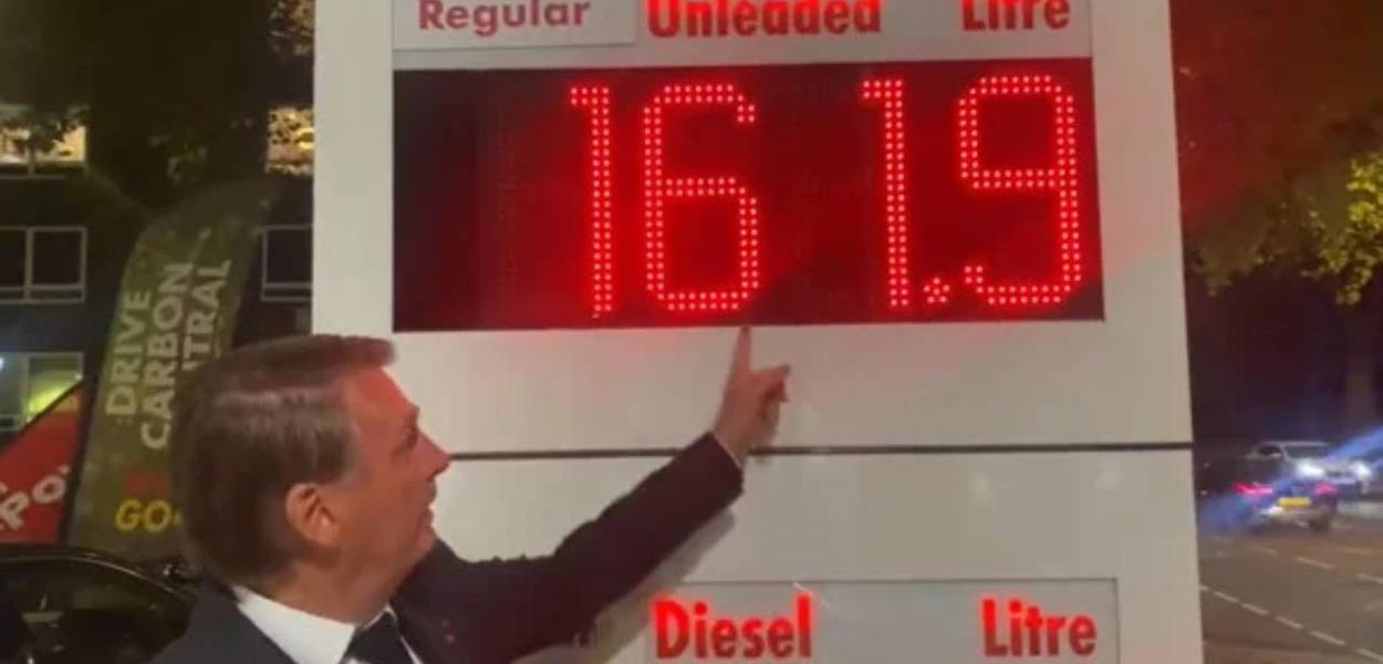 “Estou aqui em Londres, Inglaterra. O preço da gasolina: 1.61 libras. Isso dá aproximadamente 9 reais e 70 centavos o litro. Ou seja, praticamente o dobro da média de muitos estados no Brasil. Então, a gasolina é uma realidade, uma das mais baratas do mundo. Um abraço a todos do Brasil. É o governo brasileiro trabalhando por você”, disse Bolsonaro.