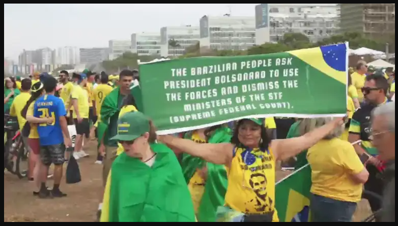 Faixas com inscrições em inglês foram vistas sendo seguradas pelos manifestantes. Uma das frases dizia: “President Bolsonaro: use the Brazilian Armed Forces and dismiss the ministers of the STF (Supreme Federal Court).” Outra pedia: “President: activate the armed forces and make democratic intervention.”