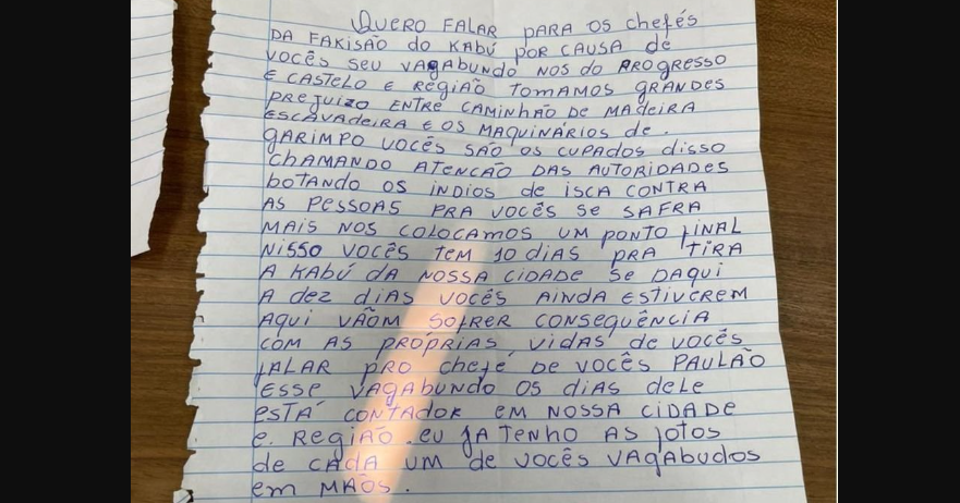 E continua ameaçando os indígenas, falando para eles deixarem a região em dez dias, pois, caso contrário, “sofrerão as consequências com as próprias vidas”; e ameaçando “Paulão”, um ex-indigenista que trabalha como consultor do Instituto Kabu: “Os dias dele estão contados”. “Eu já tenho as fotos de cada um de vocês, vagabundos, em mãos”, diz a carta.