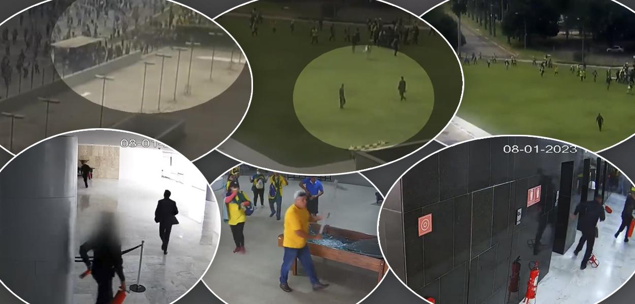 Em vários momentos, as câmeras registram os extremistas e integrantes do GSI circulando pelas dependências do Palácio do Planalto. Um outro equipamento captou o momento em que agentes do GSI deixam o segundo andar. Poucos minutos depois, o local é invadido e a câmera é quebrada pelos extremistas.