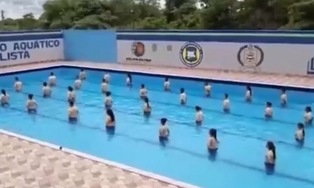 Um grupo de alunos dentro de uma piscina respondem aos comandos de um funcionário da instituição. "Em homenagem ao nosso supremo, magnífico, ao nosso comandante diretor". Em outros momentos, a idolatria seria para Caiado.