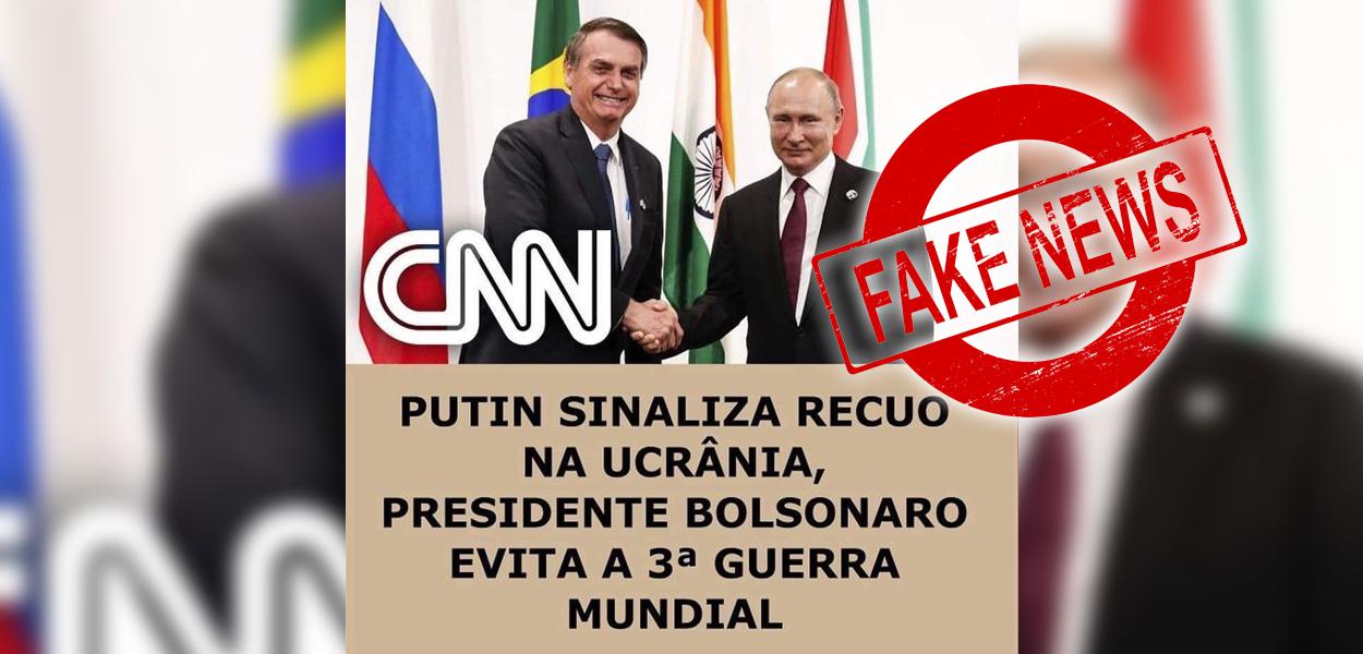 “O ex-ministro Ricardo Salles publicou hoje (15) uma montagem que atribui à CNN a informação de que o presidente Jair Bolsonaro evitou “a 3ª Guerra Mundial”. Na postagem fake, a frase mentirosa entra como suposta causa do recuo do presidente da Rússia, Vladimir Putin, para invasão da Ucrânia. A sinalização de Putin tem sido veiculada pela CNN desde ontem. A imagem publicada por Salles foi compartilhada por grupos bolsonaristas. Mais cedo, o presidente Bolsonaro publicou uma imagem em que a CNN Brasil informa o recuo de Putin”, diz a matéria da CNN