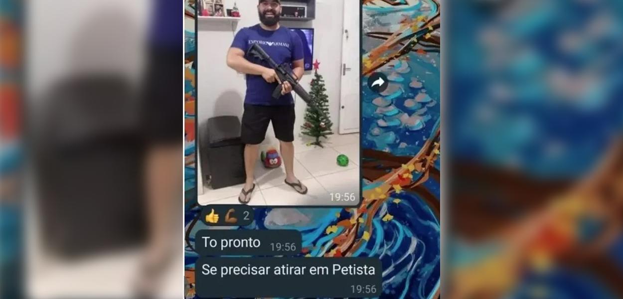 247 - Um agente patrimonial, servidor de uma escola municipal de Campo Grande, no Mato Grosso do Sul, compartilhou uma foto segurando uma arma em um grupo de WhatsApp de professores e funcionários da unidade escolar. Além do fato de estar segurando um fuzil, o servidor escreveu: "tô pronto se precisar atirar em petista".