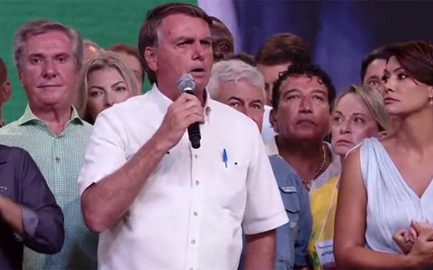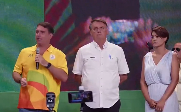 O senador Flávio Bolsonaro, em evento do PL no qual Jair Bolsonaro fez campanha antecipada, atacou Sergio Moro (Podemos) e o ex-presidente Lula (PT)