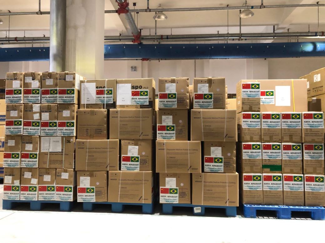 As caixas contêm máscaras cirúrgicas, óculos de segurança, luvas, entre outros materiais para profissionais que atuam no combate à Covid-19, informou pelo Twitter o embaixador chinês no Brasil, Yang Wanming.