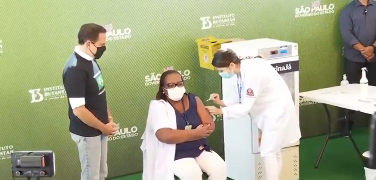 Após ser imunizada, ela recebeu do governador João Doria (PSDB) um selo simbólico com os dizeres “Estou vacinado pelo Butantan” e uma pulseira com a frase “Eu me vacinei”.