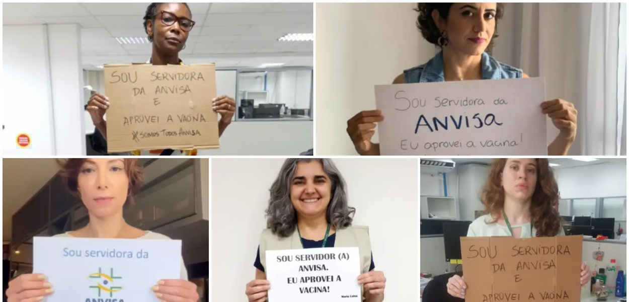 “Sou servidor da Anvisa e aprovei a vacina”, diz frase escrita em placa exibida por dezenas de trabalhadores. As fotos foram compiladas em um vídeo divulgado neste sábado (18) pela Associação de Servidores da Anvisa (Univisa). Confira:
