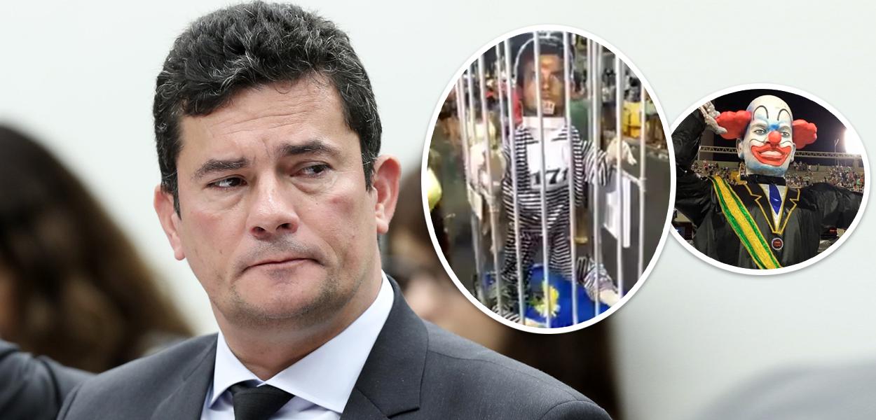 Os foliões também protestaram contra o ministro da Justiça e Segurança Pública, Sérgio Moro, que aparece encarcerado em alegoria de bloco de rua.