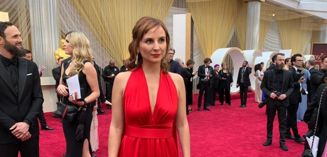 Indicada na categoria melhor documentário com seu "Democracia em vertigem", a cineasta Petra Costa defendeu o filme que retrata os bastidores do golpe de 2016. "O documentário é uma carta de amor ao Brasil", disse Petra usando um vestido longo vermelho