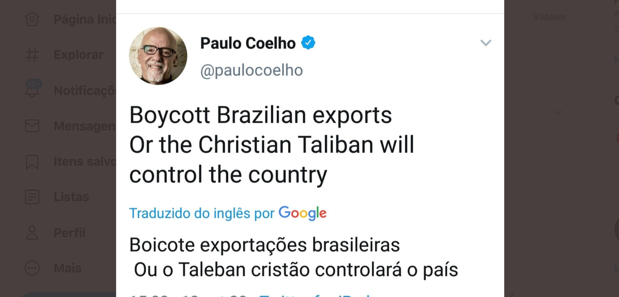 O ato de Paulo Coelho teve também um outro viés: a defesa do estado laico. “Boicote exportações brasileiras ou o Taleban cristão controlará o país”, disse ele. No entanto, pouco depois da postagem, ele mesmo apagou o tweet – o que não impediu que bolsonaristas o elegessem como alvo preferencial na noite deste domingo, com diversas postagens agressivas.