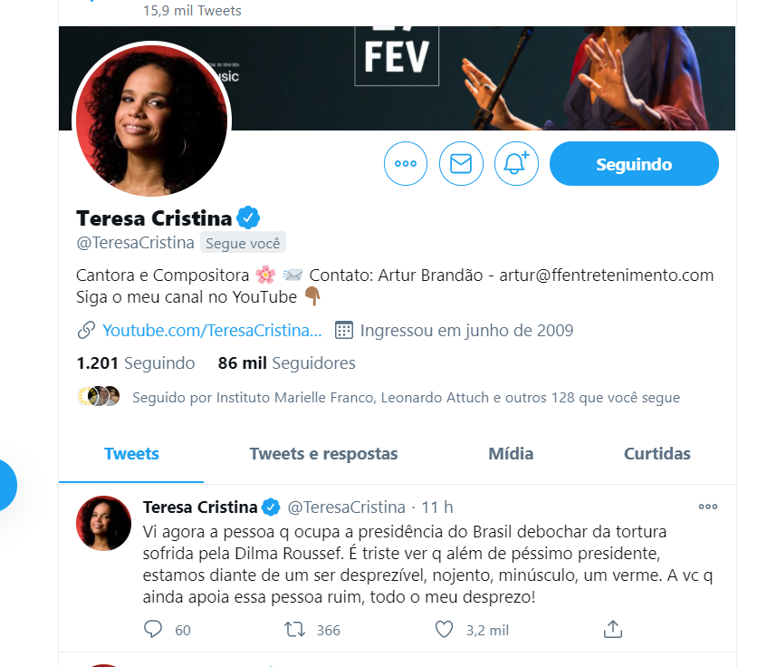 “Vi agora a pessoa q ocupa a presidência do Brasil debochar da tortura sofrida pela Dilma Roussef. É triste ver q além de péssimo presidente, estamos diante de um ser desprezível, nojento, minúsculo, um verme. A vc q ainda apoia essa pessoa ruim, todo o meu desprezo!”, postou Teresa.