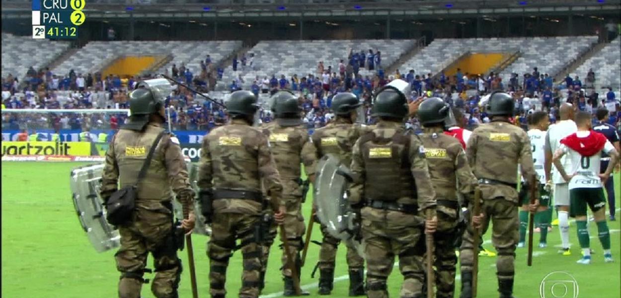 A reportagem do portal G1 destaca que "o ambiente ficou pesado. Bombas foram jogadas nas arquibancadas. Um torcedor saiu carregado, aparentemente machucado. Outro foi atendido na arquibancada. Houve invasões em alguns setores. A Polícia Militar precisou intervir. Sem condições de segurança, o árbitro Marcelo de Lima Henrique encerrou a partida. A administração do Mineirão publicou mensagens no telão solicitando para que os torcedores evacuassem o estádio."