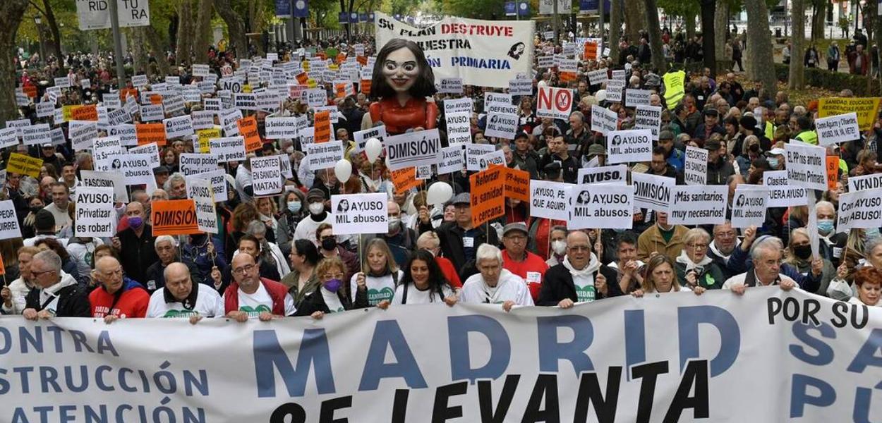 Com o lema “Madri se manifesta em apoio à saúde pública e contra os planos de destruir os serviços de atenção primária”, os manifestantes saíram de quatro pontos diferentes da cidade rumo à sede da prefeitura, na Plaza Cibeles.