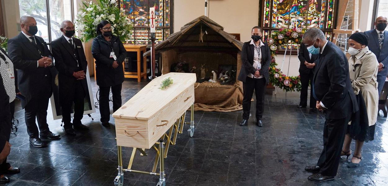 A viúva estava sentada em uma cadeira de rodas na primeira fila da congregação, envolta em um lenço roxo, cor das vestes clericais de seu marido. Ramaphosa usava uma gravata combinando.