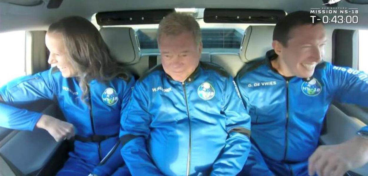 Ator William Shatner, conhecido por estrelar o Capitão James T. Kirk da nave estelar Enterprise, foi um dos quatro passageiros a viajar por cerca de 10 minutos dentro da espaçonave New Shepard