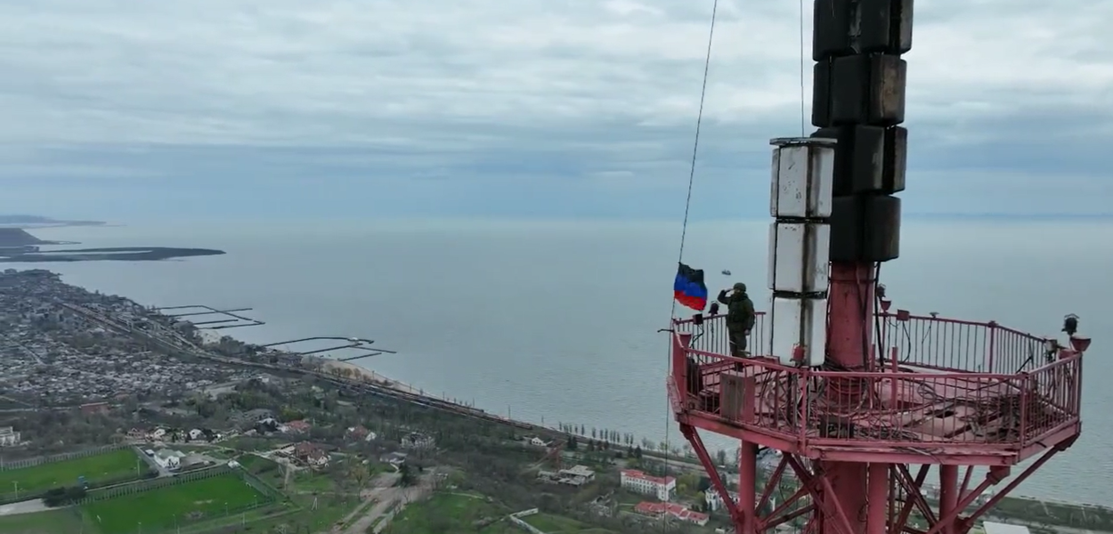 A bandeira da república separatista foi erguida na torre de televisão da cidade, o mais alto ponto de Mariupol