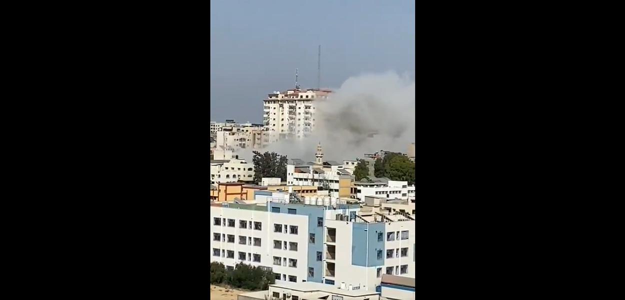 Fontes do governo palestino informam que a aviação israelense atingiu um prédio comercial de 10 andares em Bourj Falastin, no centro da cidade