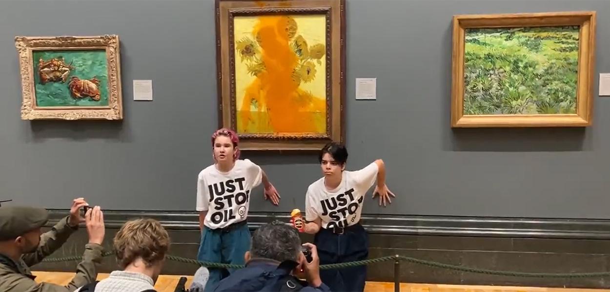 247 - Duas ativistas do grupo Just Stop Oil jogaram um pacote de sopa de tomate em "Girassóis", um dos principais quadros do pintor holandês Vincent Van Gogh, como meio de chamar atenção e pressionar o governo do Reino Unido a decretar o fim do uso de combustíveis fósseis.