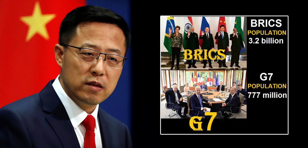 Porta-voz da Chancelaria chinesa, Zhao Lijian, publicou foto de líderes do G7, cujas populações somam 777 milhões de pessoas, enquanto os Brics abrigam 3,2 bilhões de pessoas