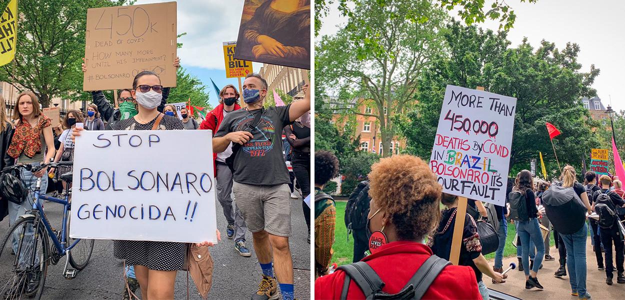 Manifestantes do exterior, como os de Londres, já exibem cartazes lembrando as mais de 450 mil vítimas fatais da Covid-19 no Brasil