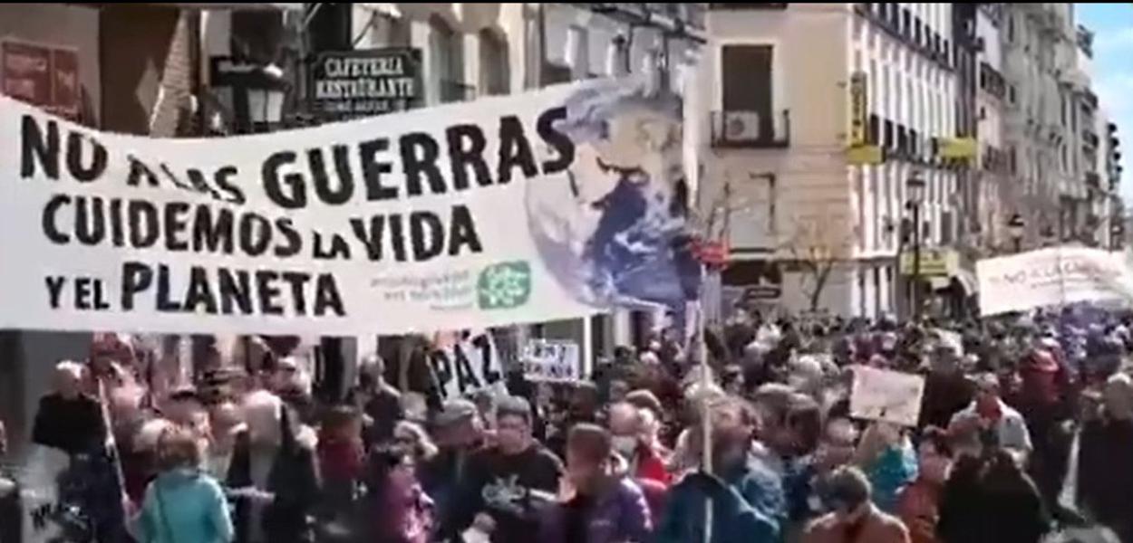 247 - Centenas de espanhóis ocuparam as ruas de Madri em protesto contra o apoio do governo à Ucrânia no conflito contra a Rússia. De acordo com a agência Sputnik, os manifestantes alegam que enquanto a Espanha financia um dos lados do conflito, os gastos com as necessidades da população são reduzidos e a qualidade de vida cai em todo o país.