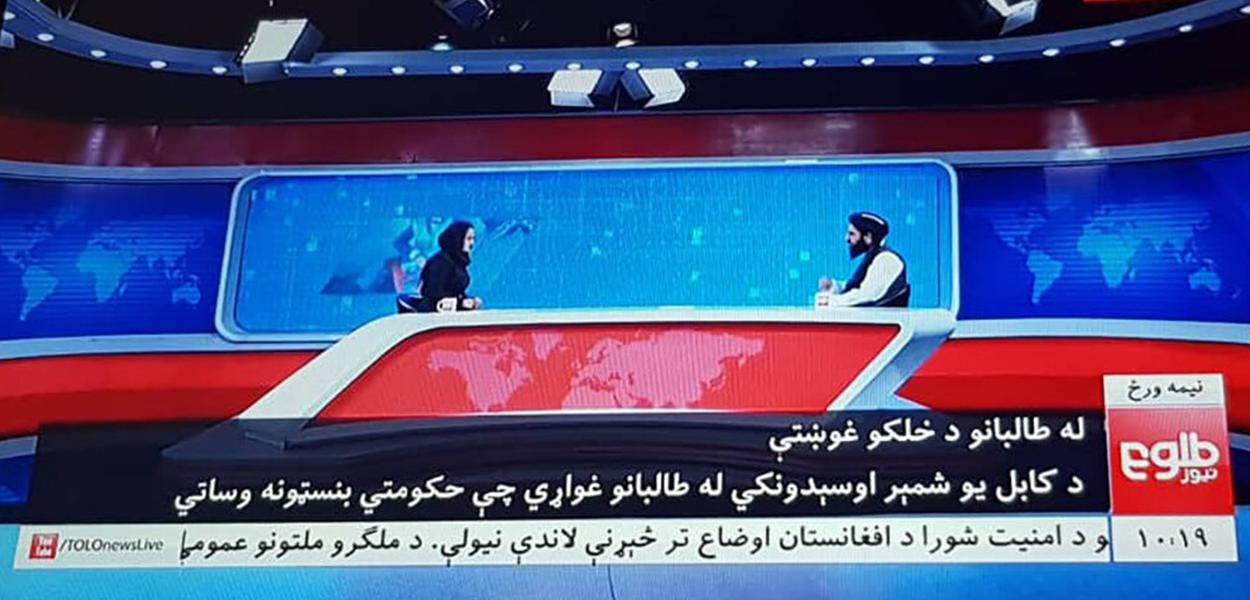 A cena foi classificada como algo inédito: uma jornalista mulher e afegã entrevistando um líder do Talibã.