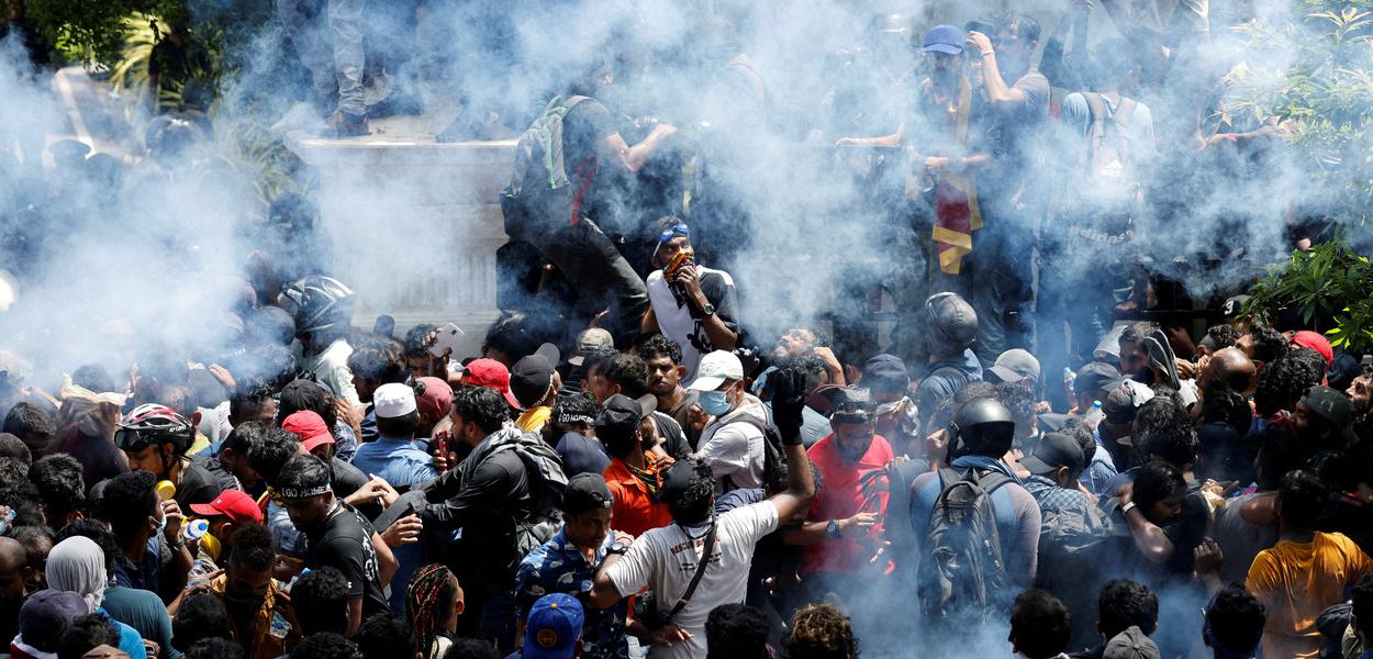 A polícia estacionada do lado de fora do gabinete do primeiro-ministro disparou várias rodadas de gás lacrimogêneo e um helicóptero militar circulou brevemente, mas os manifestantes pareciam irredutíveis e invadiram o complexo. A equipe de Wickremesinghe se recusou a revelar seu paradeiro.