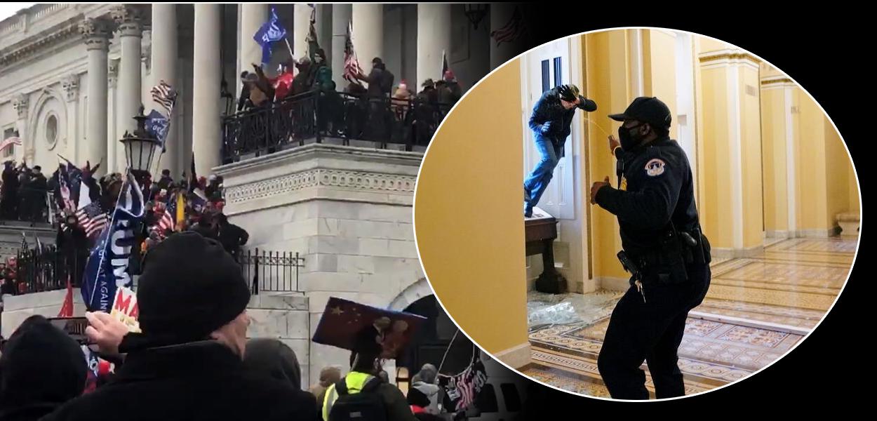 O Capitólio está em lockdown, ninguém entra ou sai, mas apoiadores de Trump estão quebrando vidros e invadindo o prédio. Além disso, os manifestantes estão se enfrentando com a polícia no local.