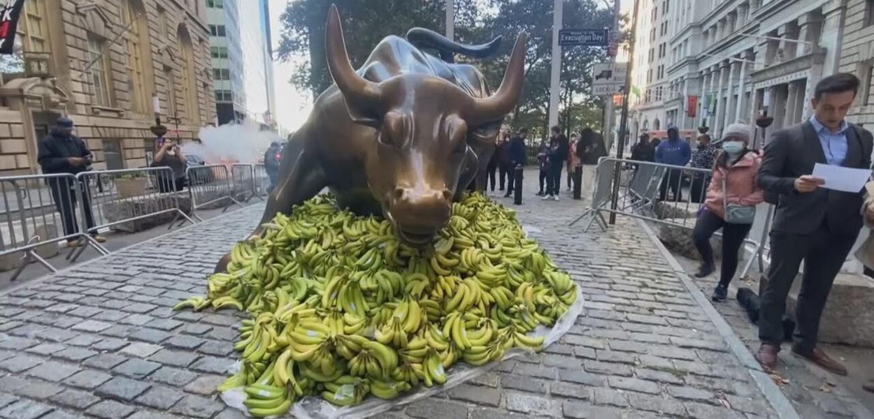 Dez mil bananas foram colocadas recentemente ao lado da famosa estátua do Touro de Wall Street