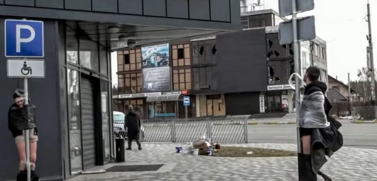 Nas imagens veiculadas pelo programa Bora Brasil, da emissora paulista, é possível ver as pessoas transitando pelas ruas de Irpin, apressadas, enquanto três acusados parcialmente pelados estão grudados nos postes de sinalização.