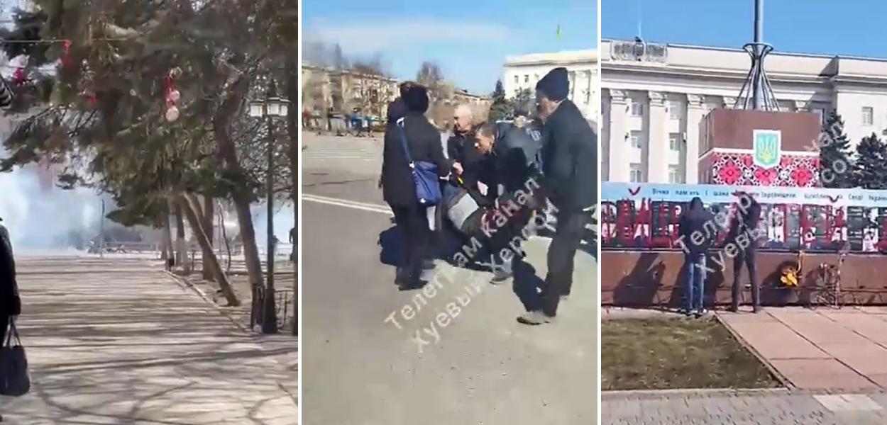 Imagens de vídeo mostraram várias centenas de manifestantes na Praça da Liberdade de Kherson correndo para escapar enquanto projéteis caem ao redor deles. Estrondos altos podem ser ouvidos e há nuvens de fumaça esbranquiçada. Tiros também podem ser ouvidos.