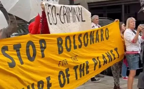 "Pare, Bolsonaro, pelo futuro do planeta", dizia uma das faixas exibidas pelos opositores