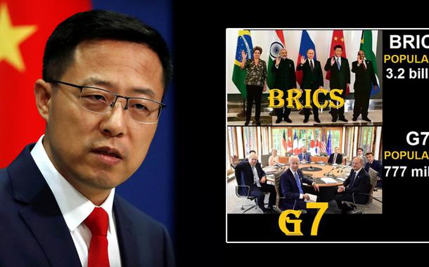 Porta-voz da Chancelaria chinesa, Zhao Lijian, publicou foto de líderes do G7, cujas populações somam 777 milhões de pessoas, enquanto os Brics abrigam 3,2 bilhões de pessoas