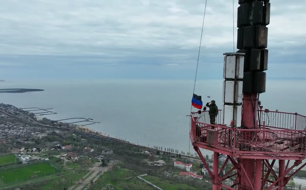 A bandeira da república separatista foi erguida na torre de televisão da cidade, o mais alto ponto de Mariupol