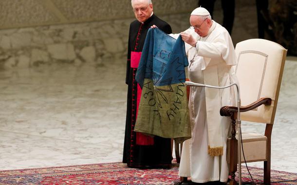 Papa Francisco disse que a bandeira escurecida e manchada, com inscrições e símbolos, chegou até ele diretamente da zona de guerra, "precisamente daquela cidade martirizada, Bucha"