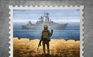 Na imagem, um soldado armado aponta o dedo do meio a um navio em alto mar. A imagem é uma referência ao episódio ocorrido na Ilha Zmiinyi no último dia 24