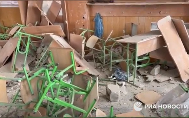 Em vídeo da agência russa RIA Novosti , divulgado pela RT, aponta-se que um míssil abriu um buraco em uma das paredes da sala de aula