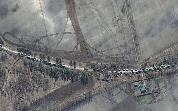 Comboio consiste em blindados, tanques, artilharia rebocada e outros veículos logísticos
