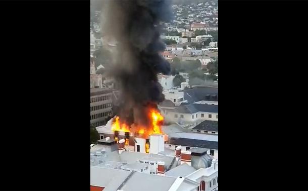 Imagens aéreas de redes de televisão mostram enormes chamas emergindo do teto