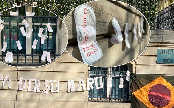 Nas grades do imóvel foram amarrados centenas de absorventes higiênicos, com as palavras de ordem "As mulheres vão te derrubar"