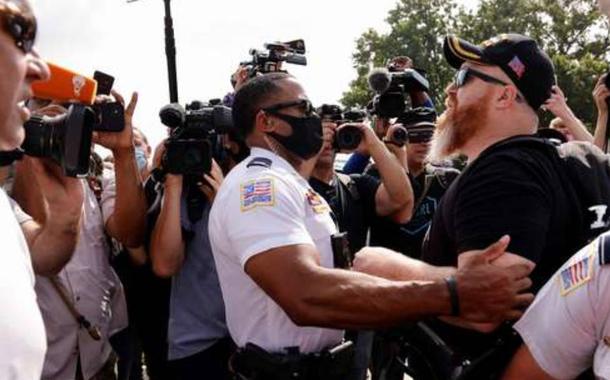 Cerca de 100 a 200 manifestantes compareceram, alguns carregando as bandeiras do grupo de direita Three Percenters sobre os ombros. Foi muito menos do que as 700 pessoas que os organizadores...